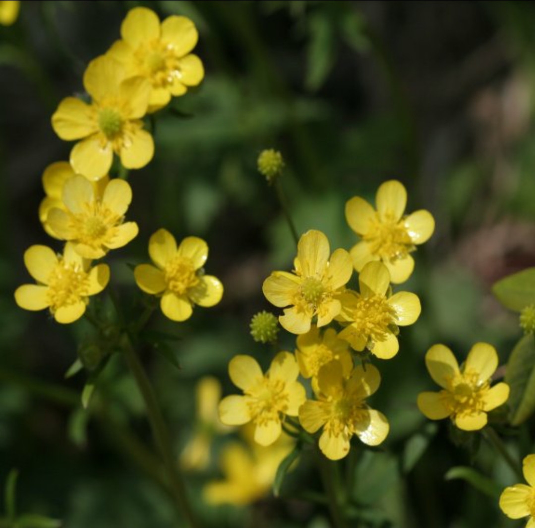 꽃은 6월에 짙은 노란 색으로 피고 취산상(聚 狀)으로 갈라진 작은꽃자루에 1개씩 달린다. 꽃받침조각은 5개이고 타원 모양이며 겉에 털이 있고 수평으로 퍼진다. 꽃잎은 5개이고 달걀을 거꾸로 세운 모양의 원형이며 꽃받침조각보다 2∼2.5배 길다. 수술과 암술은 많은 수가 있다.