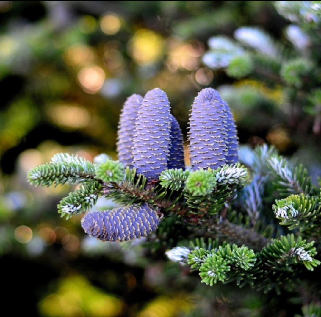 열매는 구과(毬果)로 원통형으로서 길이 10∼12cm, 지름 3.5cm 정도이고 끝이 뾰족하거나 둔하며 과경(果梗)은 길이 7mm정도이다. 10월 상순에 익는다. 실편은 거의 둥글고 길이 25∼30mm로서 흔히 밖에 수지가 묻으며 포는 밖으로 나타나지 않고 거의 원형이다.