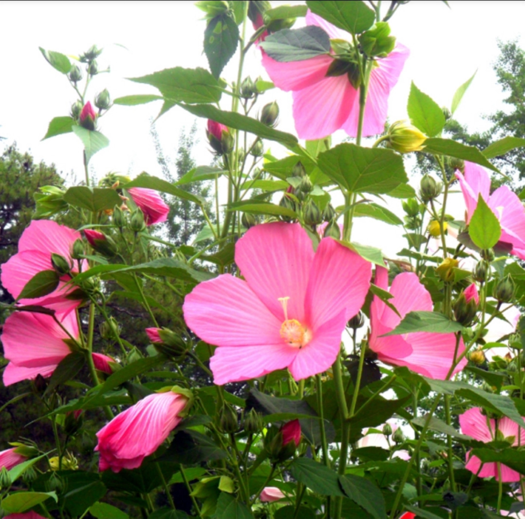 꽃은 8∼10월에 피고 지름 10∼13cm로 연한 홍색으로 취산상으로 윗부분의 잎겨드랑이에 1개씩 달린다. 꽃받침은 보통 중앙까지 5개로 갈라지고 선모(腺毛)가 있으며 꽃받침보다 긴 소포(小苞)가 있다.