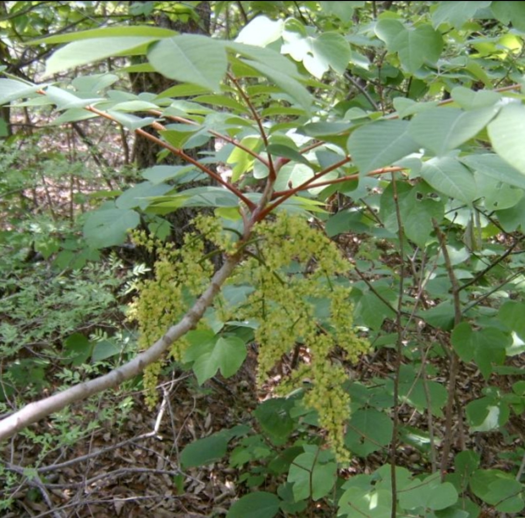 산허리나 산기슭에서 자란다. 높이 약 7m이다. 작은가지와 잎자루는 붉은빛을 띤 갈색이며 털이 난다. 잎은 어긋나고 잎자루와 더불어 길이 20∼40cm이며 홀수1회 깃꼴겹잎이다. 작은잎은 13∼17개이고 잎자루는 짧으며 달걀 모양 또는 긴 타원형이다. 잎 밑은 둥글고 끝은 뾰족하며 길이 4∼10cm, 나비 3∼5cm이다. 겉면 맥 위에 털이 나거나 없으며, 뒷면 맥 위에는 털이 난다. 가장자리는 밋밋하거나 톱니가 2∼3개 있는 것이 있다.