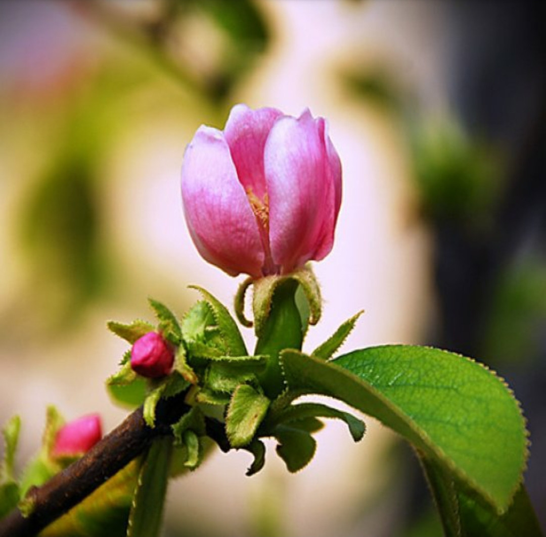 잎은 어긋나고 타원상 달걀모양 또는 긴 타원형이다. 잎 윗가장자리에 잔 톱니가 있고 밑부분에는 선(腺)이 있으며 턱잎은 일찍 떨어진다. 꽃은 연한 홍색으로 5월에 피고 지름 2.5∼3cm이며 1개씩 달린다. 꽃잎은 달걀을 거꾸로 세운 모양이고 끝이 오목하다.