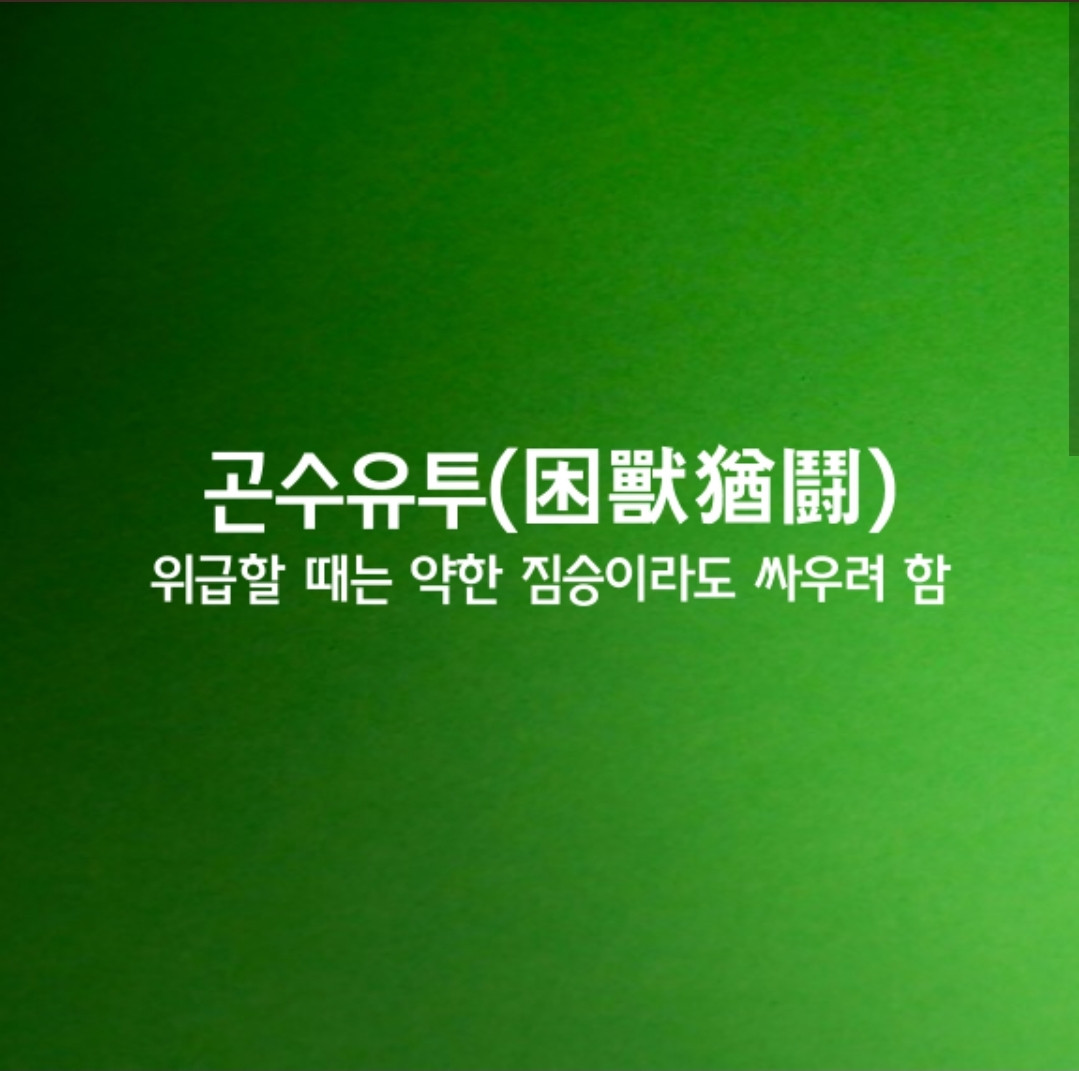 아무리 약한 짐승이라도 곤경에 빠지면(困獸) 오히려 덤벼든다(猶鬪)는 이 말도 마찬가지 뜻이다. ‘春秋左氏傳(춘추좌씨전)’에 나온다. 무지렁이 순박한 사람일수록 어려움에 처하게 되면 이판사판 저항하게 되는 것을 비유했다. 사지에 몰린 적을 벼랑까지 쫓으면 결사적인 반격을 받게 되므로 피해야 한다는 孫子兵法(손자병법)의 窮寇勿迫(궁구물박)도 같은 의미의 경계다.