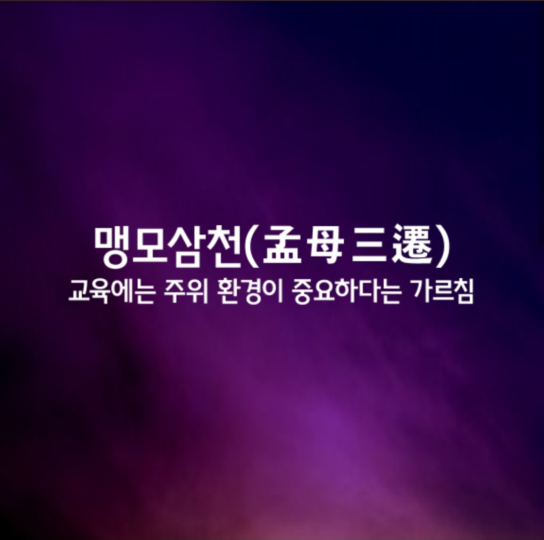 맹자(孟子)의 어머니가 맹자(孟子)를 제대로 교육(敎育)하기 위(爲)하여 집을 세 번이나 옮겼다는 뜻으로,교육(敎育)에는 주위(周圍) 환경(環境)이 중요(重要)하다는 가르침
