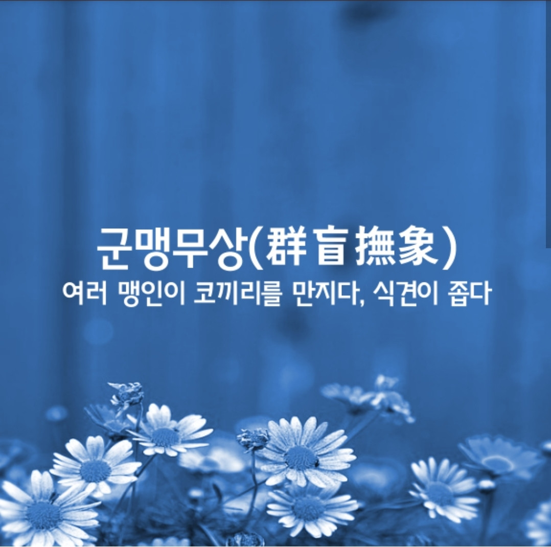 여러 맹인(盲人)이 코끼리를 더듬는다는 뜻으로,즉 자기(自己)의 좁은 소견(所見)과 주관(主觀)으로 사물(事物)을 그릇 판단(判斷)함. 범인(凡人)은 모든 사물을 자기 주관대로 판단하거나 그 일부밖에 파악하지 못함을 비유한 말이다.