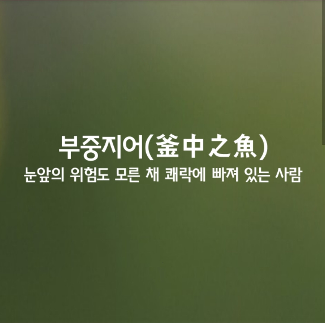 솥 안의 물고기, 곧 삶아지는 것도 모르고 솥 안에서 헤엄치고 있는 물고기. 눈앞에 닥칠 위험도 모른 채 쾌락에 빠져 있는 사람을 말한다.