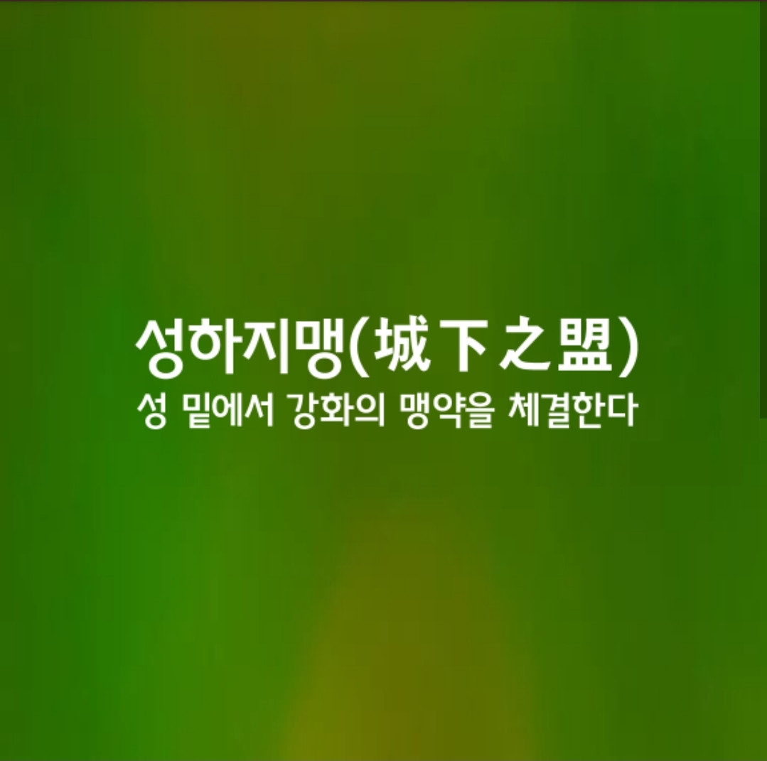 성 밑에서 강화의 맹약을 체결한다는 뜻으로 대단히 굴욕적인 항복이나 강화를 의미한다. 수도(首都)의 성 밑까지 적군(敵軍)의 공격(攻擊)을 받아 할 수 없이 강화(講和)를 맹세(盟誓)하고 굳게 약속(約束)한다는 뜻으로,대단히 굴욕적(屈辱的)인 강화(講和)나 항복(降伏)을 이르는 말