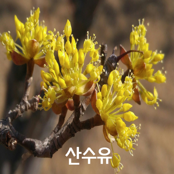 층층나무과의 낙엽교목인 산수유나무의 열매이다. 타원형의 핵과(核果)로서 처음에는 녹색이었다가 8~10월에 붉게 익는다. 종자는 긴 타원형이며, 능선이 있다. 약간의 단맛과 함께 떫고 강한 신맛이 난다. 10월 중순의 상강(霜降) 이후에 수확하는데, 육질과 씨앗을 분리하여 육질은 술과 차 및 한약의 재료로 사용한다.