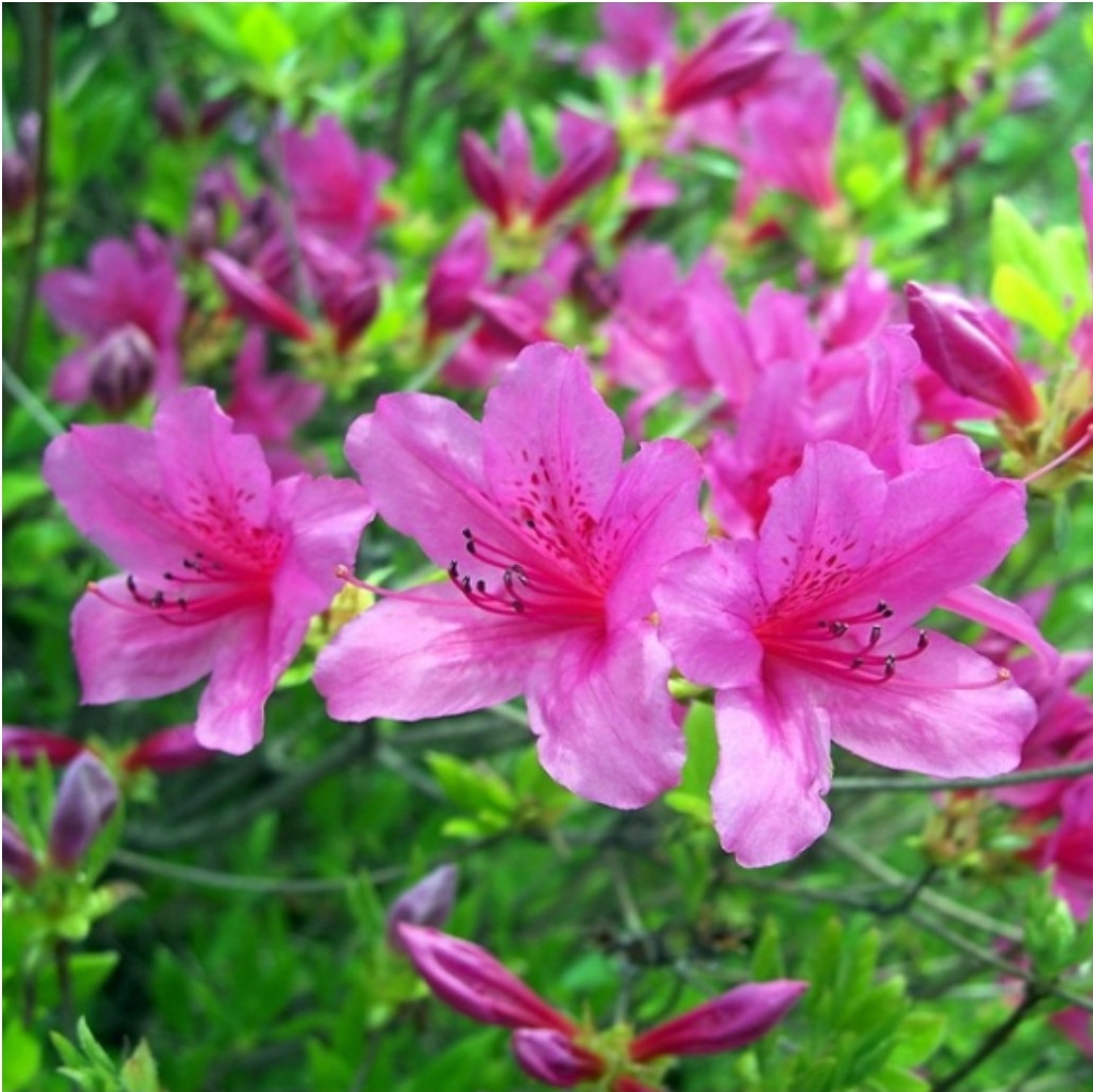 꽃은 4∼5월에 붉은빛이 강한 연한 자주색으로 피고 가지 끝에 2∼3개씩 달린다. 화관은 지름 5∼6cm의 깔때기 모양이고 5개로 갈라지며 안쪽 윗부분에 짙은 자주색의 반점이 있다. 꽃받침은 갈색 털이 있으며 5개로 갈라지고, 갈라진 조각은 길이 4∼8mm의 좁은 달걀 모양이다. 수술은 10개이고 꽃밥은 자줏빛이 돈다. 암술대는 털이 없거나 밑 부분에 누운 털이 있고, 씨방에는 갈색 털이 있다.
