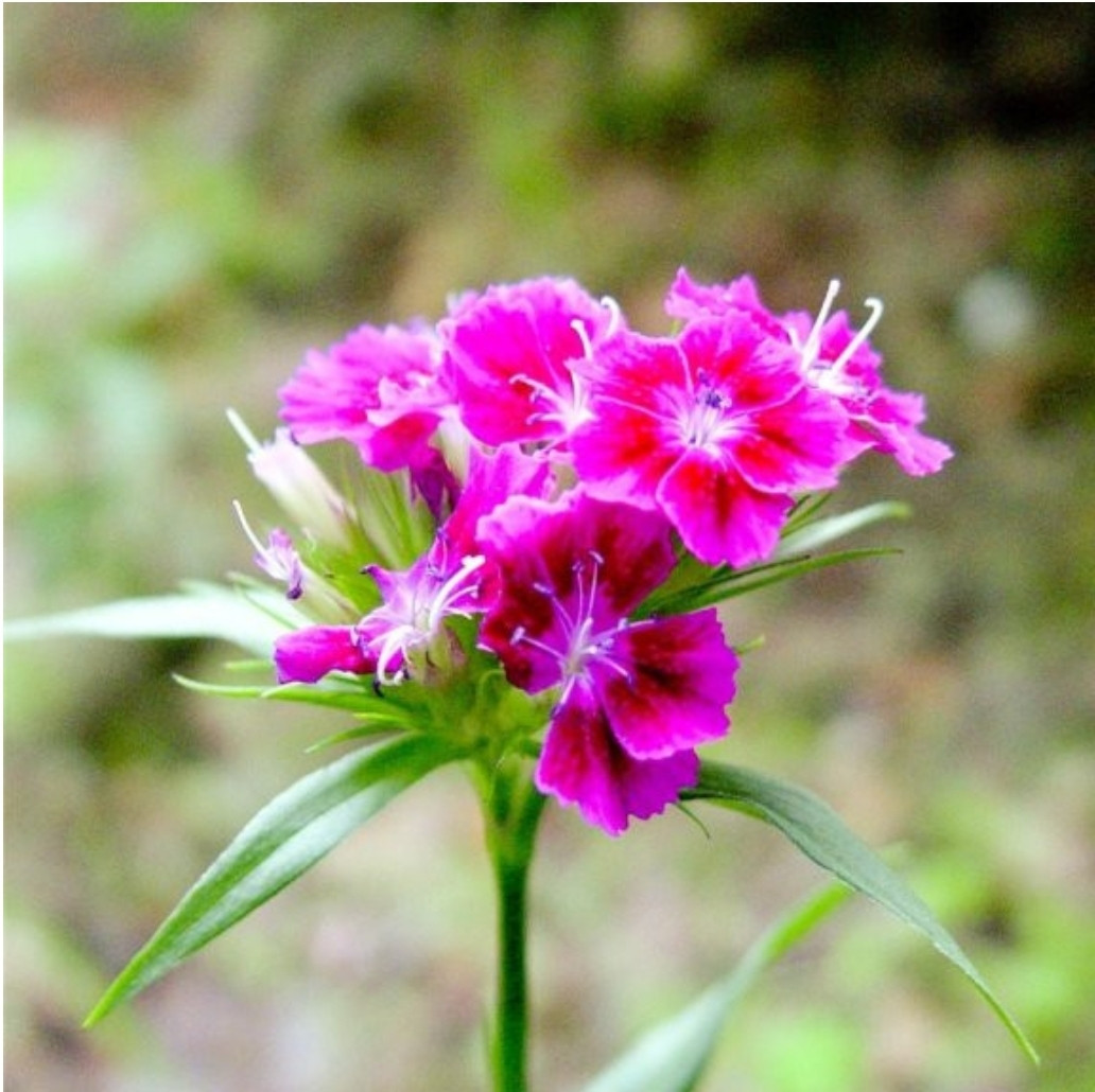 꽃은 6∼8월에 피고 지름 1cm 정도이며 흔히 붉은 바탕에 짙은 무늬가 있으나 여러 가지 색깔이 있다. 취산꽃차례는 원줄기 끝에 달리고 빽빽이 모여 있어 산방상으로 보인다. 꽃받침조각과 꽃잎은 5개씩이고 꽃잎은 끝에 톱니가 있으며 밑부분에 털이 있다. 꽃잎은 겹으로 된 것도 있다. 수술은 10개이며 암술대는 2개로 갈라진다.