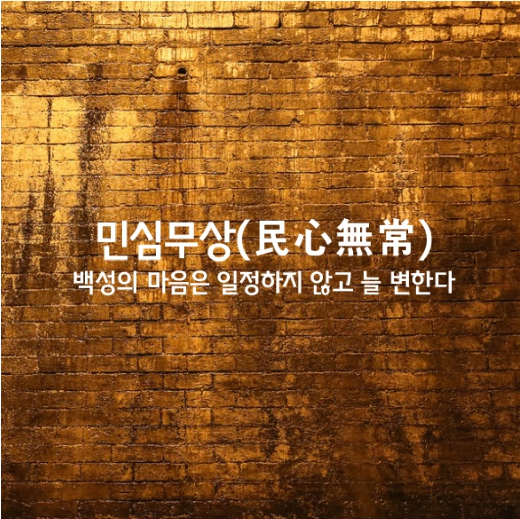 민심은 늘 변한다는 성어는 春秋(춘추) 이전의 역사와 문화를 담은 ‘書經(서경)’에 등장한다. 항상 숭상해야 한다고 尙書(상서)라고도 한다는 책이다. 요순과 夏(하), 殷(은) 다음의 周書(주서) 蔡仲之命(채중지명)편에 실린 내용이다. 채중지는 모반을 꾀했던 부친과는 달리 현명한 사람으로 周公(주공)의 추천을 받고 蔡(채) 땅의 제후로 봉해진 사람이다. 부분을 인용해보자. ‘하늘은 특별히 누구에게만 가까이하는 일 없이 오직 덕 있는 사람이면 그를 돕는다, 백성의 마음은 일정하지 아니하여 오직 혜택을 주는 사람에게 따르게 마련이다(皇天無親 惟德是輔 民心無常 惟惠之懷/ 황천무친 유덕시보 민심무상 유혜지회).’ 泰誓中(태서중)편의 ‘하늘은 우리 백성들의 눈을 통해 보고, 하늘은 우리 백성들의 귀를 통해 듣는다(天視自我民視 天聽自我民聽/ 천시자아민시 천청자아민청)’는 말도 같은 맥락이다.