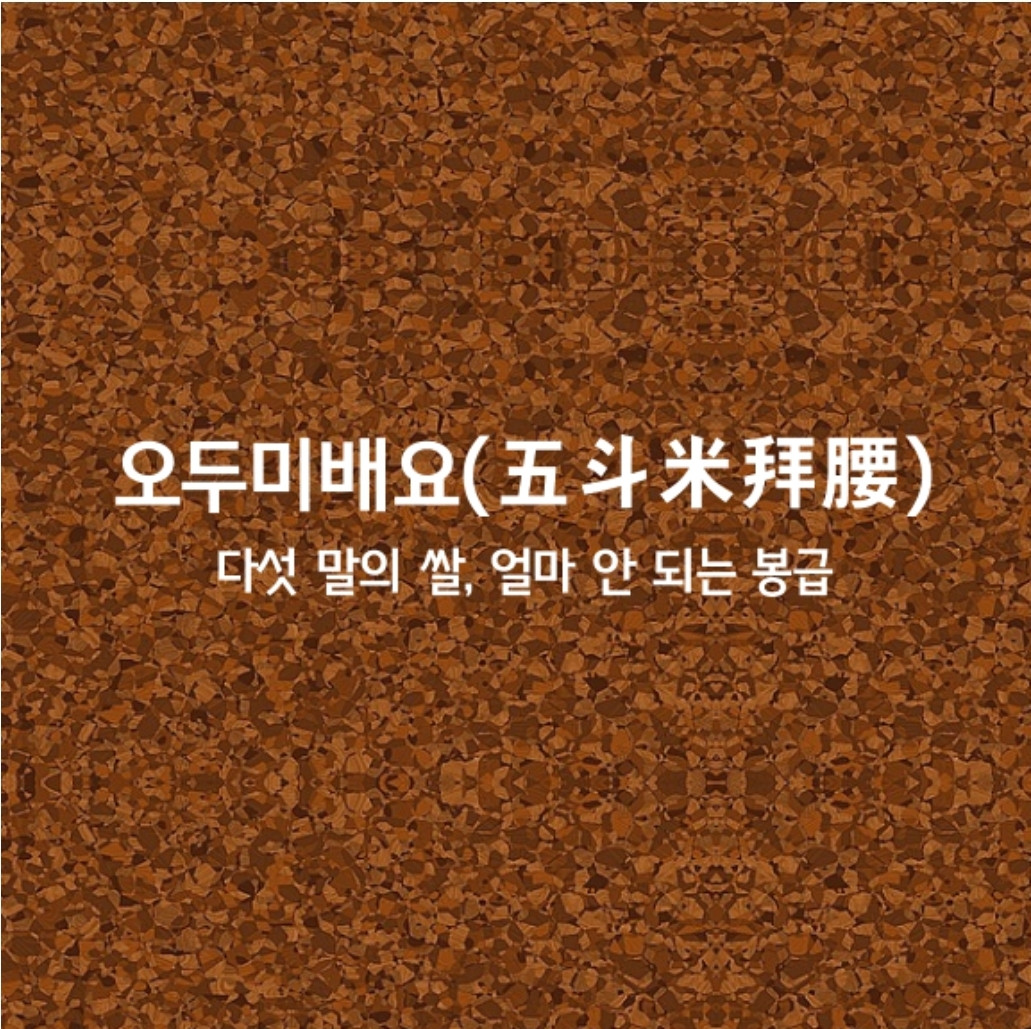 다섯 말의 쌀(五斗米)이라 하면 五斗米教(오두미교)를 생각하는 사람이 있을 것이다. 중국 後漢(후한) 말기에 나타난 道敎(도교)의 일파로 처음 들어갈 때 다섯 말의 쌀을 바치게 했기 때문에 이름 붙여졌다고 한다. 대부분의 사람들은 陶淵明(도연명)이 그까짓 다섯 말의 녹봉 때문에 지방관을 허리 굽혀 맞이할 수 없다고 내팽개친 일을 더 생생히 기억할 것이다. 여기에서 다섯 말의 쌀이라 하면 얼마 안 되는 봉급을 이르는 말이 됐다.