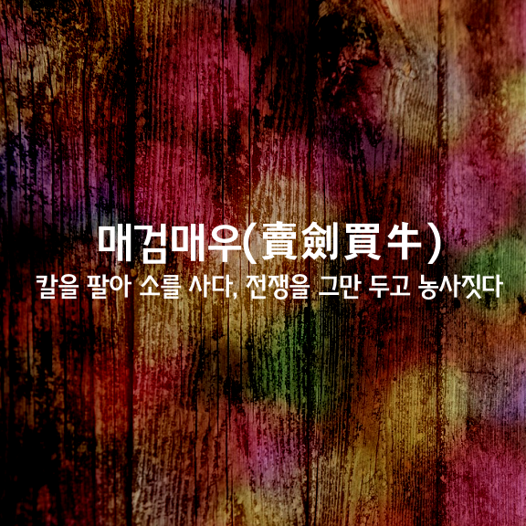 칼을 팔아 소를 사다, 전쟁을 그만 두고 농사짓다, 평화의 세상이 되다. 칼을 더 이상 소용없다고 팔아(賣劍) 농사지을 소를 사게 한다면(買牛), 어리석은 일이 아니라 백성을 가장 잘 다스리는 현명한 방법이었다. 원래는 봉건 통치자들이 불만을 품고 봉기한 농민들로 하여금 칼을 놓고 농사를 짓게 한다는 뜻으로 송아지를 산다는 賣刀買犢(매도매독)도 같은 말이다.