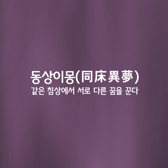 같은 침상(寢床)에서 서로 다른 꿈을 꾼다는 뜻으로, ①겉으로는 같이 행동(行動)하면서 속으로는 각기 딴 생각을 함을 이르는 말 ②비유적(比喩的)으로, 같은 입장(立場), 일인데도 목표(目標)가 저마다 다름을 일컫는 말이다.