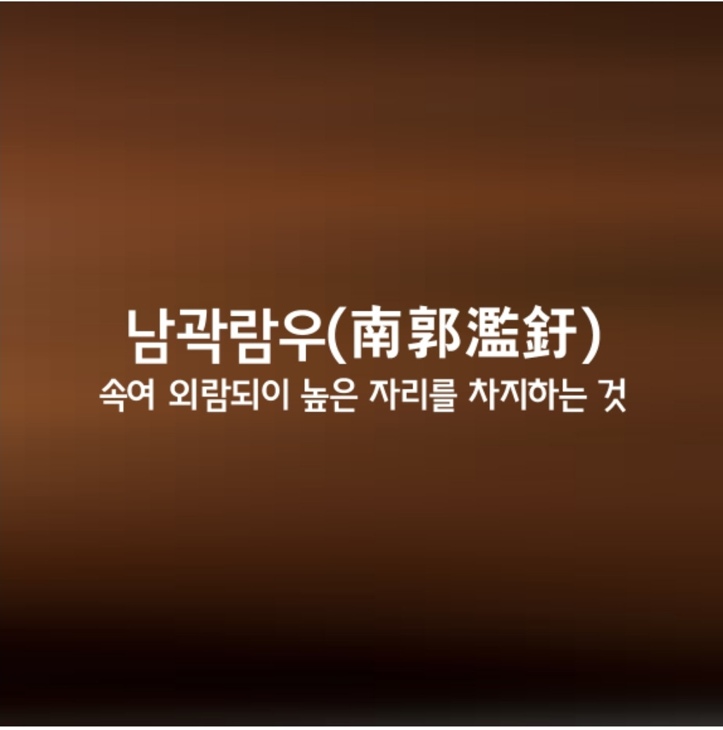 남곽이 함부로 우(대나무로 만든 악기로 피리의 일종이다)를 분다. 능력이 없는 사람이 능력이 있는 것처럼 속여 외람되이 높은 자리를 차지하는 것을 비유한다.