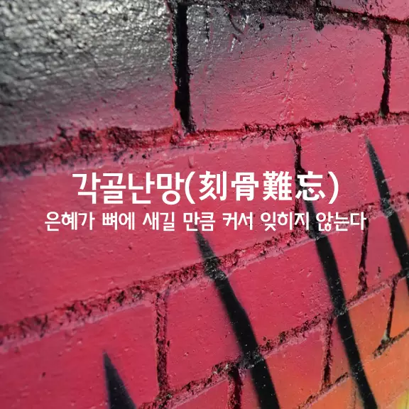 뼈에 새길(刻骨) 정도로 잊을 수 없다(難忘)는 말은 원한을 잊을 수 없다는 뜻도 되겠지만 은혜를 잊지 못한다고 강조할 때 더 많이 쓴다. 증오나 한을 잊지 못할 때는 骨髓(골수)에 사무치다, ‘뼛골에 사무치다’로 약간 달리 표현한다. 남에게 큰 은혜를 입고도 갚을 생각도 하지 않는 사람이 많은지 ‘머리 검은 짐승은 남의 공을 모른다’는 속담이 전한다. 또 ‘큰 은혜는 갚을 생각도 하지 않으면서 작은 원한은 반드시 갚으려 한다‘고 菜根譚(채근담)에도 타이른다. 이런 사람들을 위해 고사를 인용하면서 곧잘 깨우치는 성어가 많다.