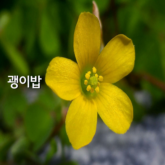 괭이밥은 우리나라 각처의 들이나 밭에서 흔히 나는 다년생 초본이다, 생육환경은 햇볕이 잘 들어오는 곳이면 어디에서나 잘 자란다. 키는 10~30㎝가량 되고, 잎은 마주나고 3개의 작은 잎이 옆으로 펼쳐져 있고 길이와 폭이 1~2.5㎝가량 되며 가장자리와 뒷면에 털이 약간 있고 햇볕이 부족할 때는 오므라든다. 꽃은 잎겨드랑이에서 길게 나오며 황색이고 지름은 약 0.8㎝ 정도이다. 열매는 9월경에 길이 1.5~2.5㎝가량으로 달리고 안에는 많은 종자가 들어 있다. 관상용으로 쓰이며, 잎은 식용으로 사용한다.
