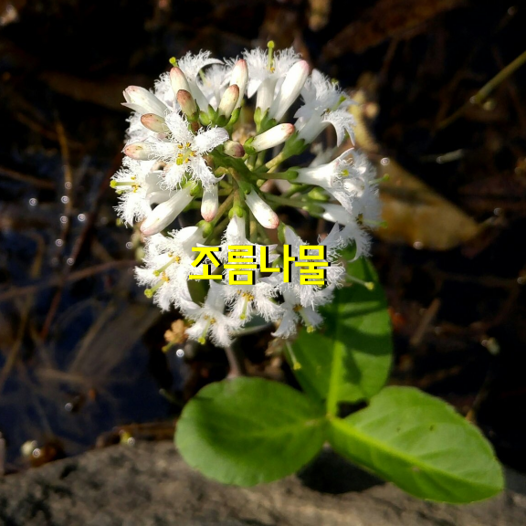 연못이나 늪에서 자란다. 굵은 뿌리줄기가 옆으로 뻗으면서 끝에서 잎자루가 긴 세 장의 작은잎이 나온 잎이 5∼6개씩 나온다. 작은잎은 긴 타원형·달걀 모양의 타원형 또는 사각상 타원형으로 잎자루가 없고 가장자리에 둔한 톱니가 있거나 밋밋하다. 꽃은 7∼8월에 피고 백색이며 총상꽃차례로 달린다.