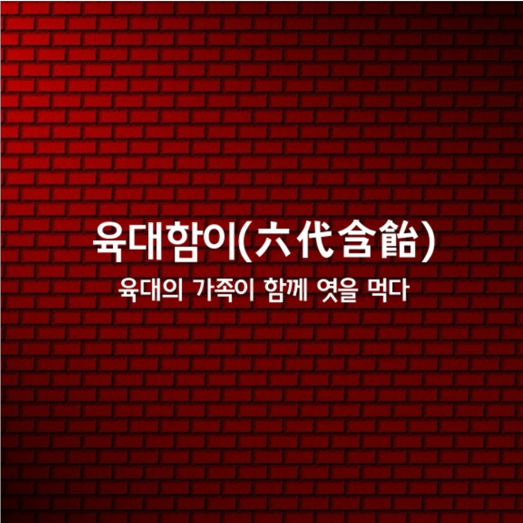 六代(육대)의 가족들이 함께 엿을 먹는다(含飴)는 이 말은 孔子(공자)의 집안을 가리켰다. 6대의 가족이 한 집안에서 사이좋게 살아간다니 1세대 30년을 당시 공자의 어머니가 결혼했다는 19세로 치더라도 114세의 할아버지 아래 손자가 태어난 것이 된다. 공자의 고향 山東(산동)성의 曲阜(곡부)에는 淸(청)나라 乾隆帝(건륭제)가 보낸 ‘六代含飴(육대함이)’의 편액이 남아 있다고 한다.