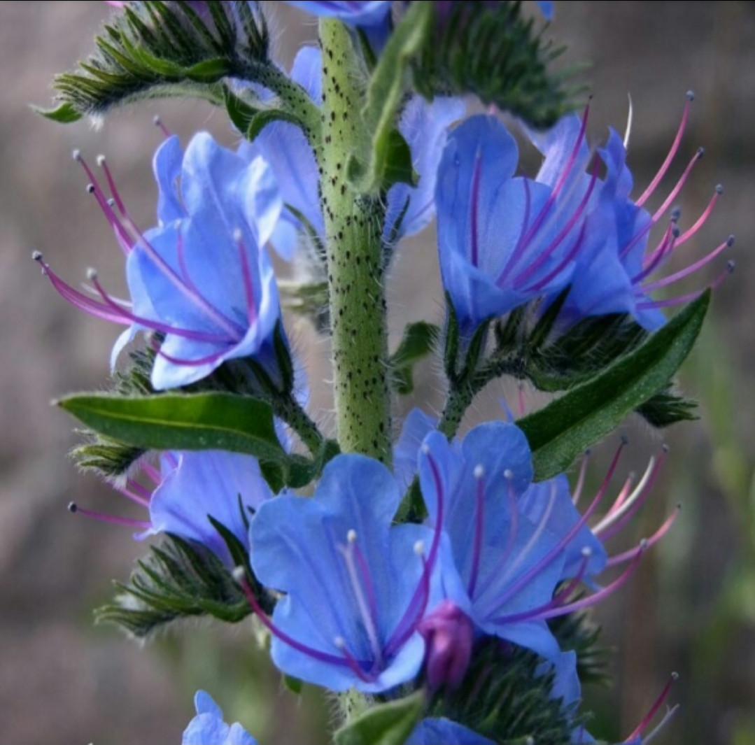 높이 30∼100cm까지 자란다. 가지를 잘 치는 편이며 전체적으로 흰색의 센털이 뻣뻣하고 촘촘하게 자란다. 잎은 마주나며 창처럼 생겼거나 타원형으로 생겼고 아래쪽으로 갈수록 크기가 커져 길이 10m에 달하는 것도 있다. 6∼9월이 되면 가지 꼭대기의 잎겨드랑이에 파란색 꽃이 핀다. 처음에는 꽃잎 끝이 말려 있다가 종 모양으로 벌어진다.