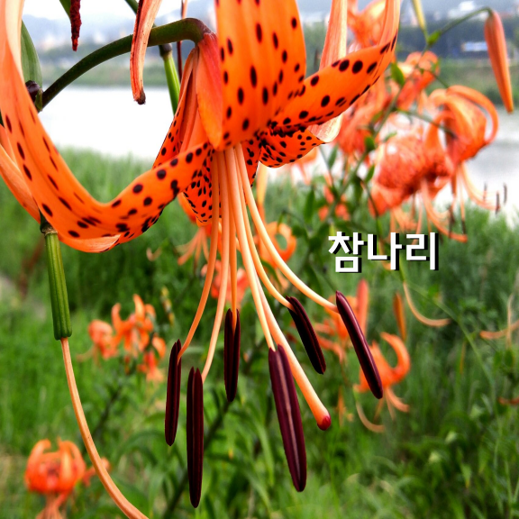 꽃은 7∼8월에 피고 노란빛이 도는 붉은 색 바탕에 검은빛이 도는 자주색 점이 많으며 지름이 10∼12cm이고 4∼20개가 밑을 향하여 달린다. 화피 조각은 6개이고 바소꼴이며 뒤로 심하게 말린다. 밀구(蜜溝)에 털이 있고, 6개의 수술과 1개의 암술이 길게 꽃 밖으로 나오며, 꽃밥은 짙은 붉은빛을 띤 갈색이다.