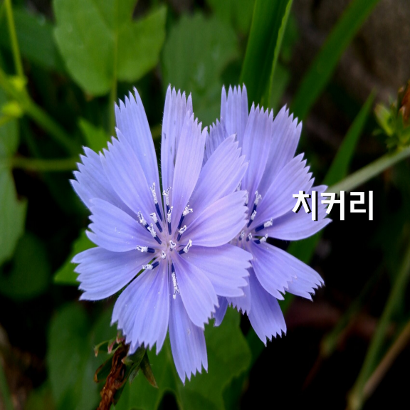 꽃은 7∼9월에 하늘색으로 피고 줄기 윗부분 잎겨드랑이와 줄기 끝에 설상화가 두상꽃차례를 이루며 달린다. 총포는 원기둥 모양이고 총포 조각은 2개로 갈라진다. 품종에 따라 흰색 또는 엷은 붉은 색의 꽃도 있다.